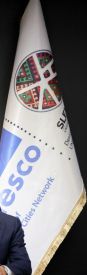 depicts a blue-and-white version of the UNESCO logo, reading underneath "unesco"