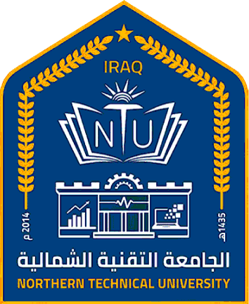 The logo of Northern Technical University has a golden border shaped as a dome. At the bottom is Northern Technical University in Arabic (white) and in English (gold). The background of this logo is blue. To the sides are golden branches, curved and pointing to a star. Underneath this star is IRAQ in gold. Underneath them is a symbol and years of foundation; to the left 2014 in the regular calendar and to the right 1435 as the Hiriji year of its establishment, both in white. In the center: above is an open book reading its initials of N and U on its pages, stylized to show more pages. In between the two pages is a stylized torch of enlightenment; below: a castle depicting a graph rising (left) on its tower; a computer screen with symbols emerging (right) on its tower; in the center a depiction of a monitor; and above this two cogwheels. These show the mission of the university.