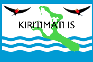 The flag of Kiritimati is divided white over blue by four wavy blue and white stripes and is overlain by a green map of the island. In the upper hoist and upper fly are two flying birds. The whole is edged by a thin blue border, and the island name is written in black across the middle.