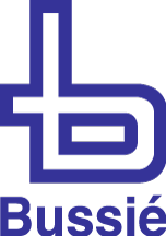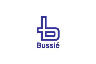 The logo is a monocolor blue, having a lowercase "b" merged with a "t". Underneath is Bussié also in blue.