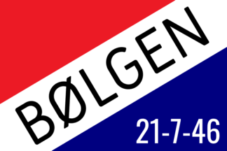 The flag of flag of IL Bølgen (Idrettslaget Bølgen) from Bugøynes in Sør-Varanger Municipality is diagonally divided red-white-blue on a rising diagonal with the name in the white stripe and a date in the blue field.