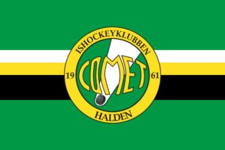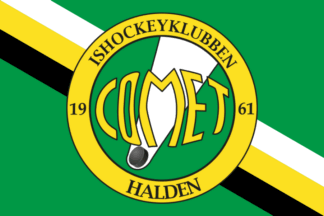 The flags of IK Comet (Ishockeyklubben Comet) from Halden are green with horizontal or diagonal bands in white, black, yellow, and the badge centered.