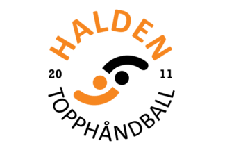 The flags of Halden Topphåndball from Halden show a central logo in orange, black or white on fields of contrasting colors.