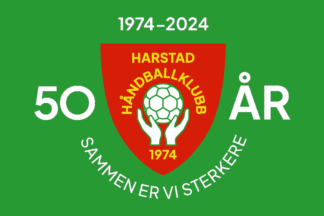 A 50th anniversary flag of Harstad HK (Harstad Håndballklubb) from Harstad, is green with the badge centered and the years and anniversary date in white.