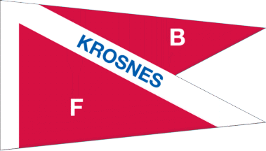 The flag of Krosnes Båtforening from Onsøy in Fredrikstad Municipality is a red swallowtail pennant with a white descending diagonal bearing the name in blue and white letters B and F in the red fields.
