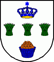 Shield Argent three wheat sheaves Vert in fess, between a Marian crown Azure garnished Or on chief and a Azure filled with agricultural products proper.