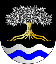 Shield Sable a chestnut tree Argent, trunked and eradicated Or, on base wavy Argent a barrulet wavy Azure. Mural crown Argent with three visible towers (village rank) and short white scroll, in Bénard Guedes style, reading in black upper case serifed letters "PENUDE"