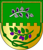 Shield Vert on a wall embattled Or issuant from base a plum tree branch Vert fructed Purple,