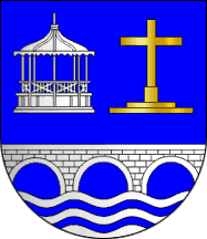 Shield Azure a band-stand Argent and a wayside cross Or in fess, issuant from flanches and from base wavy Argent, charged with a bar gemel wavy Azure, a three arch bridge Argent masoned Sable.