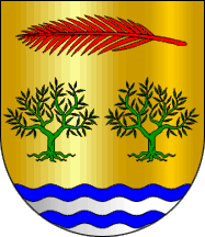 Shield Or two olive trees eradicated Vert arrayed in fess, in chief a palm frond Gules, base wavy Azure and Argent barrully wavy of four.