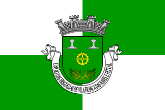 Mural crown Argent with three visible towers (village rank) and white scroll reading in black upper case serifed letters "VILA FRANCA DAS NAVES".