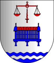 Shield Argent a raised granary Azure roofed Gules, in chief a pair of scales Gules, held up by a sword flamant Gules in pale, base wavy Azure a bar wavy Argent.