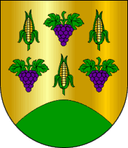 Shield Or three maize ears Or (!) leafed Vert and three grape bunches Purple leafed Vert staggered and arrayed in two fesses, issuant from base a mound Vert.