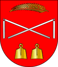 Shield Gules two flails Argent in saltire, in chief a palm frond Or, in base two hoe blades Or in fess.