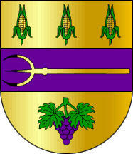 Shield Or on a fess Purple a pitch fork Or, in chief three maize ears Or leafed Vert in pale and arrayed per fess, in base a grape bunch Purple leafed Vert.