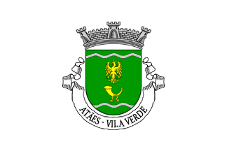 Mural crown Argent with three visible towers (village rank) and white scroll reading in black upper case serifed letters "ATÃES - VILA VERDE"".