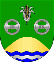 Shield Vert two wheels Argent arrayed in fess with their spokes in fess, in chief a maize ear Or leafed Argent, issuant from base wavy Azure, charged with a bar Argent, a mound Or (see left image above).