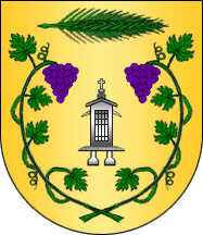 Shield Or a raised granary Argent surrounded at base and flanches by two grapevines Vert fructed Purple in orle and crossed per saltire at base, in chief a palm frond Vert.