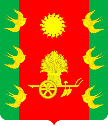 On a red field between green edges – a golden wheeled plow with a sheaf of wheat on it, accompanied upwards by a golden flaming sun without a face in a column; and on the sides – three golden swallows on each side, arranged in a column above the borders of the edges and taking off in the same direction. The coat of arms is crowned with a three-pronged golden crown of the pattern established for rural settlements. The depiction of the coat of arms without the crown is permitted.