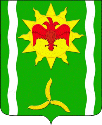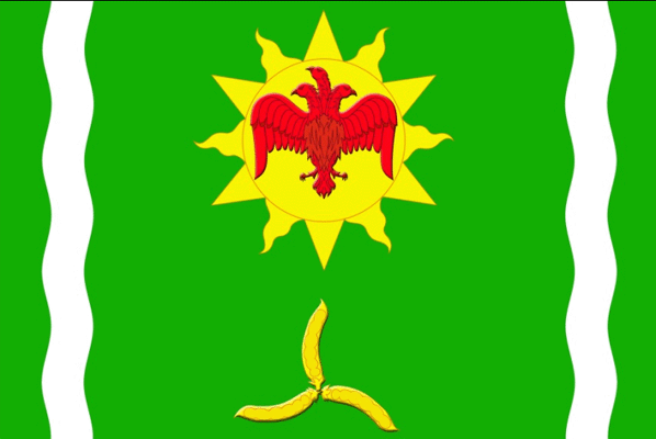 In a green field between wavy silver pillars shown at the edges, at the top is a golden sun, burdened with a scarlet three-headed eagle with outstretched wings; below are three golden soybean pods (one and two), connected in a star.
