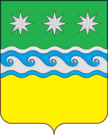 In a crossed green-gold field, above the division is an azure-silver wavy belt, crossed in the form of waves running to the left and thinly bordered with alternating colors; at the top, the belt is accompanied by three silver eight-pointed stars.