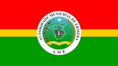 Unfortunately, there is no official description of the symbolism. The seal depicts a map of the municipality of Ermera, divided into its named administrative districts, including their names. At its center stands a traditional stone altar, similar to those found in Apido. On the altar stands a totem (called Ai To'os in Timor). Below it, a spring flows into a red basin (?). Above the map is a white star, similar to the one on the national flag. To the left, a coffee branch forms the frame, and to the right, a branch with cotton and a grain. The usual staple foods here would be maize, rice, or cassava. Below the map, the motto "USI TONKA BIA TANE" is displayed in a yellow banner. The background color of the seal transitions from light blue at the top to medium green. It is unclear in which language the inscription is written. Mambae is the primary language spoken in the municipality, along with Kemak. In Tetum, the official language, which is related to both languages, "Usi" is a title of ruler, "tonka" means "to support," and "tane" means "to offer." Around the seal, the official name of the authority, "AUTORIDADE MUNICIPAL DE ERMERA," is written in Portuguese. The abbreviation AME is shown below. The flag appears to have a 2:3 aspect ratio and is horizontally divided into three stripes in a 4:1:4 ratio. The colors are red, golden yellow, and medium green. The municipal seal is positioned in the center, spanning half the flag's height.