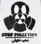 Yellow- and white-field "Stop Pollution" flags carried during protests demanding the dismantling of the state-run phosphate-processing plant in Gabes, Tunisia c. Oct. 31, 2025. The central image is that of a gas-mask that has been re-drawn as a "death skull" with a "radioactive danger" logo as its nose with air-filters on either side, and beneath it is the slogan "STOP POLLUTION" in both English and Arabic. A hidden flag-pole sleeve appears at the left hoist side.