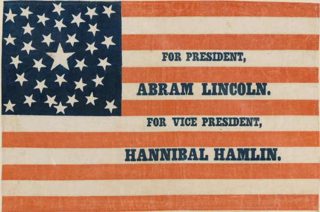 Lincoln & Hamlin Campaign Flag. 13" x 8.25" glazed cotton flag with 31 stars in the canton, inscribed on the stripes: "For President, Abram Lincoln. For Vice President, Hannibal Hamlin"; c. 1860. [Photo credit: Heritage Auctions.]