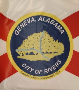 The flag was designed by resident Jerry Elmore and adopted by city council on March 2, 2020. The flag is of a white field and a red crimson St. Andrews cross, which is the base of the Alabama state flag. In the center is the Geneva city seal.
