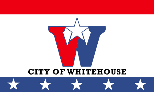 "The municipal flag shall be a field of white with a narrow red stripe at the top and a wide blue stripe at the bottom for a field of five white stars. The red and blue “W” with a large white star in the top center shall prominently occupy the center of the field of white. The words “CITY OF WHITEHOUSE” in blue shall be located below the “W”."