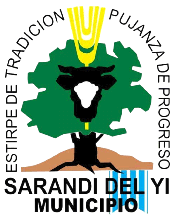 It is unknown when the coat of arms of Sarandí del Yi was adopted; however, it has been used since the time of the Local Autonomous Junta before municipalities existed (being seen on a 125th anniversary stamp in 2000). After becoming a Municipality in 2010, the word MUNICIPIO was added to the bottom. It has the format of a logo, having in the center: a tree over soil; over the top of the tree is an ear of wheat for agriculture and a cow over it for cattle ranching, symbolic of the industry here. Curved around this, the words ESTIRPE DE TRADICION [Lineage of Tradition] and PUJANZA DE PROGRESO [Push of Progress] are read. In a thicker font at the bottom, Sarandí DEL YI is read; with MUNICIPIO underneath. Behind this, a ribbon in the stripes of the National Colors (blue-white) is seen. The tree can mean the name (Sarandí, a type of bush) or simply the landscape.