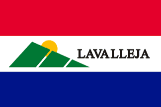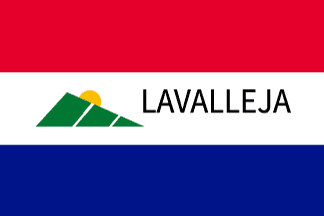 There are two primary variants of the flag: one with text that is centered on the Y-axis and another that isn't. Across versions of the flag, the font and hill size can also differ. The flag was adopted officially through Decree Nš 822 on 12 December 1990, of which the design came from a contest. The designer is unknown. The flag features three horizontal bands of red, white, and blue reminiscent of the flag of the Orientals led by Juan Antonio Lavalleja during the fight for independence. In the center slightly to the left, a green triangle with two white lines through it is seen, a representation of the Cerro Arequita hill. Behind it, the Sun of May can be seen shining and is a national symbol. To the right, LAVALLEJA is read in black.