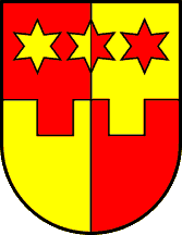 c) Party per pale and per bend embattled Gules and Or in chief three mullets of the second and first counterchanged.