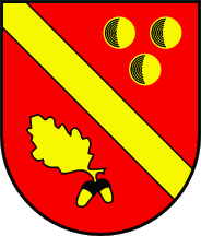 a) Gules a bend between three balls and an oak twig all Or;