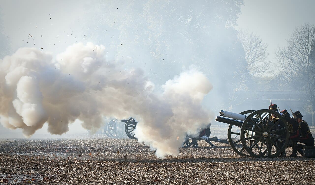 Gun Salute, Holland ca. 1680 (Wikimedia); Gun Salute by the Royal Horse Artillery UK (Wikimedia)